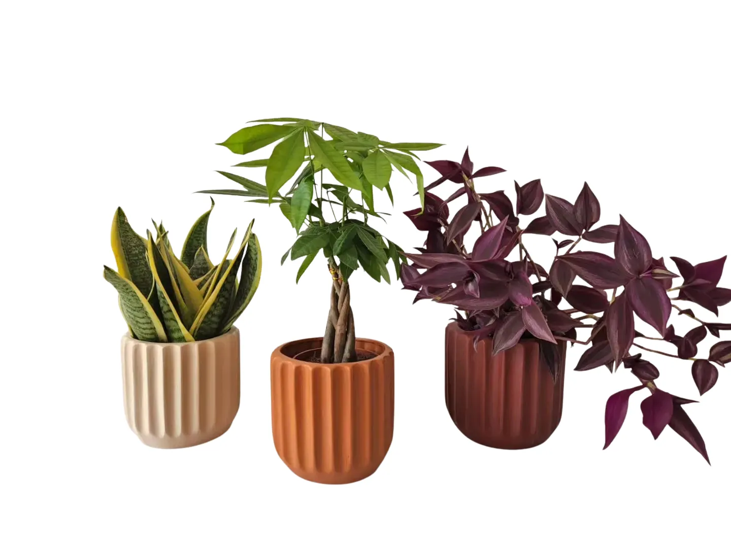 تضم هذه المجموعة ثلاث نبتات داخلية متناسقة تضيف تنوعًا جميلًا من الأشكال والألوان إلى أي مساحة. تحتوي على نبتة السانسيفيريا (نبات الثعبان)، الباشيرا، ونبتة القلب البنفسجي، وجميعها مزروعة في أصص فخارية أنيقة، لتكون مجموعة جاهزة وسهلة التنسيق.