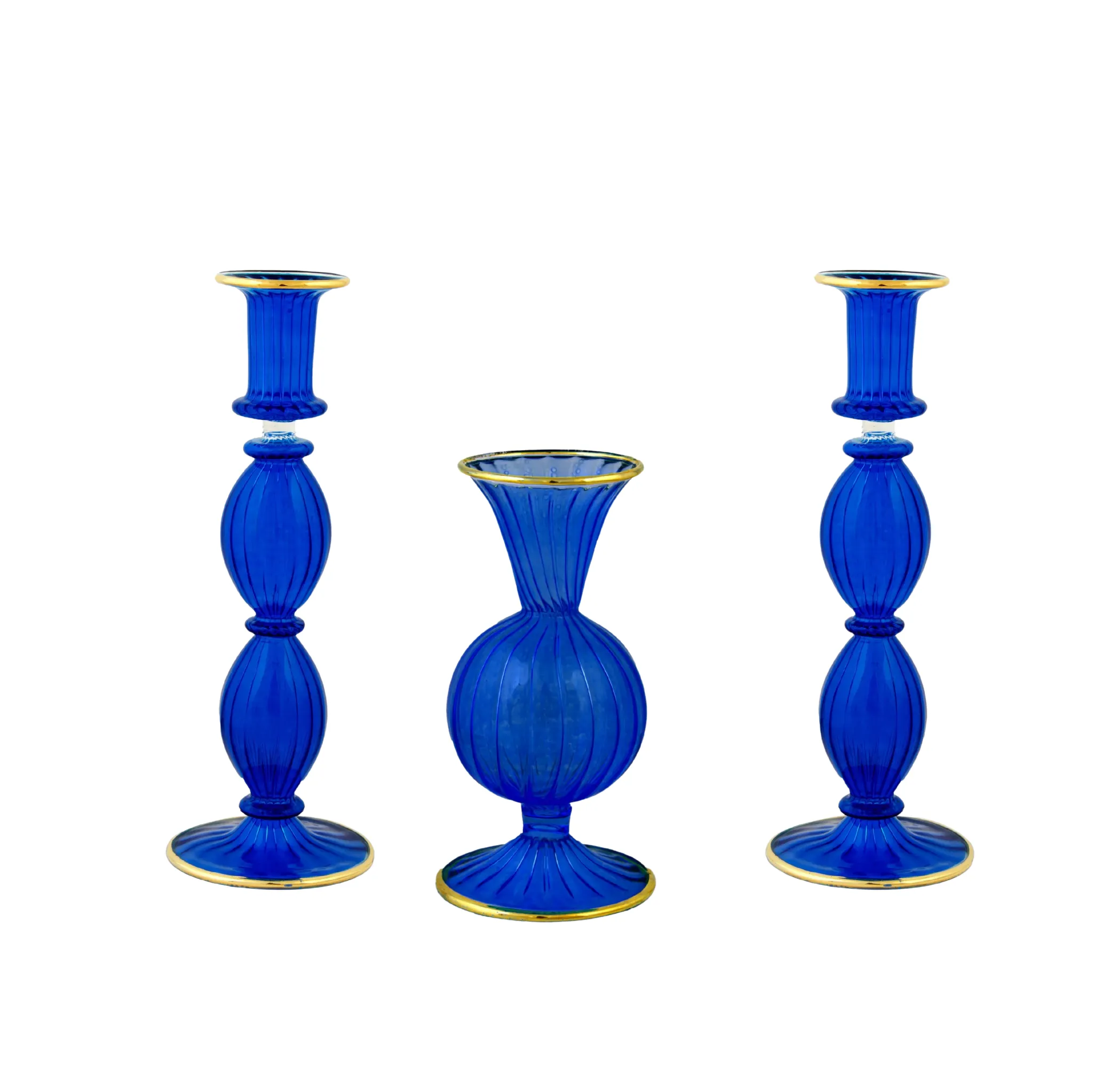 تتكون هذه المجموعة الأنيقة من 3 قطع زجاجية يدوية الصنع، تشمل شمعدانين نحيفين بلون أزرق وكأس زهرية متناسقة. يضفي الزجاج الأزرق الكوبالت لمسة من الفخامة والفن، مما يجعلها مثالية للاستخدام اليومي والمناسبات الخاصة. يتميز الشمعدانان بشكل رشيق يناسب الشموع الرفيعة، بينما تضيف المزهرية لمسة ناعمة وأنيقة لتنسيق الزهور.