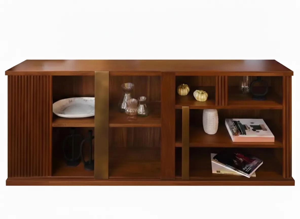 طاولة كونسول تجمع بين خشب الزان وقشرة الجوز مع طلاء باللون الذهبي الفاخر. تصميمها الأنيق يجعلها إضافة مميزة للمداخل أو الممرات أو غرف المعيشة