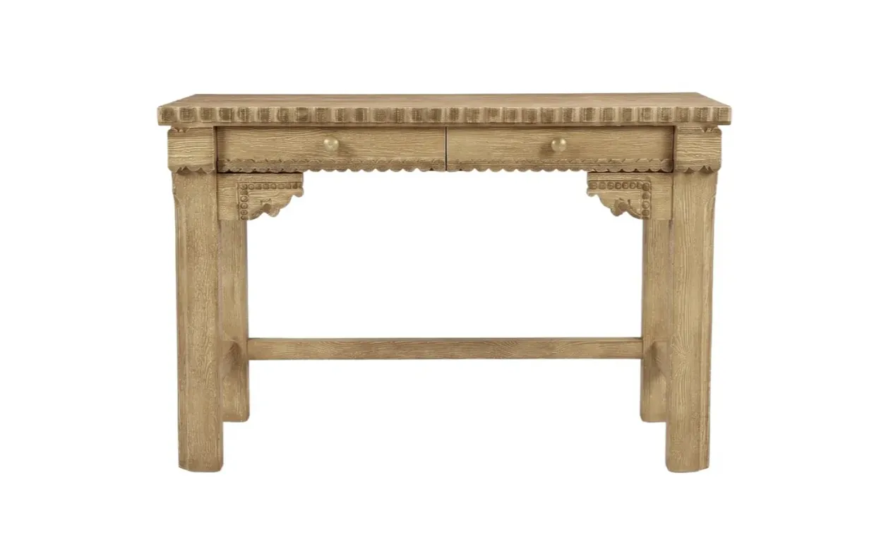 تسريحة تتميز بتشطيب خشبي طبيعي فاتح يبرز الهوية الأصلية لعروق الخشب. يتحدد التصميم بحواف متموجة لافتة للنظر على طول السطح العلوي وقاعدة الأدراج، مما يخلق ظلاً إيقاعياً متموجاً يمنح القطعة طابعاً يدوياً راقياً.