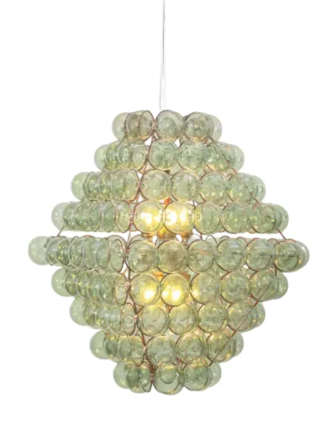 نجفة يدوية الصنع تتميز بعناقيد من الكرات الزجاجية المتدلية داخل إطار معدني رفيع وأنيق. تم تشكيل كل كرة بعناية فائقة لتوزع الضوء برقة وتخلق تفاعلاً جذاباً بين الظل والنور. نجفة أنيقة وفنية تضفي حضوراً بارزاً ولمسة من الرقي على غرف المعيشة أو الطعام أو المداخل الواسعة.