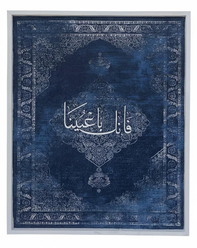 تجمع لوحة رحمة بين فخامة نقوش السجاد الشرقي وجمال الخط العربي في درجات الأزرق العميق التي تضفي إحساساً بالهدوء والرقي. تصميمها الغني بالتفاصيل يمنح الجدار حضوراً مميزاً بطابع ثقافي أنيق.