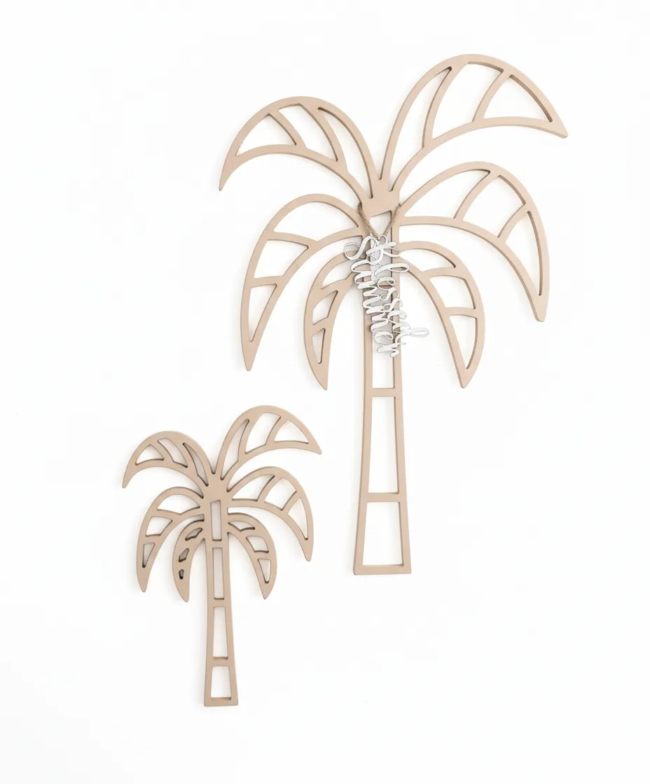استمتع بأجواء الصيف الدائمة مع مجموعة “بالمس آند بليسينغ” التي تضم نخيلتين خشبيتين بلون بيج رملي هادئ، تضفيان لمسة استوائية طبيعية على جدرانك.