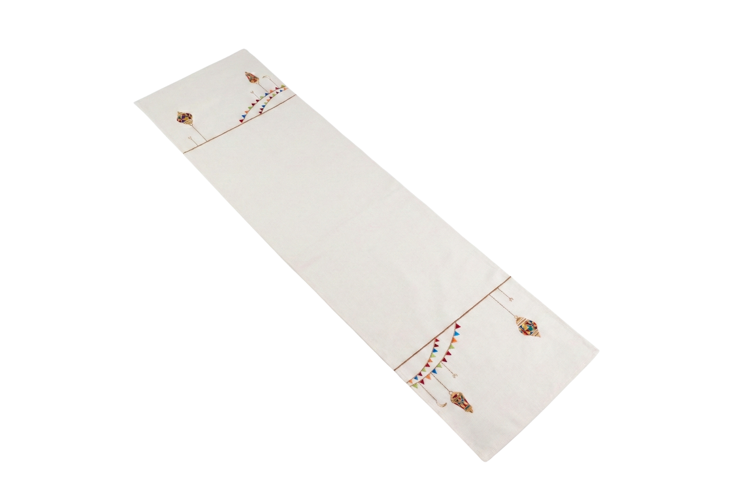 أضيفي أجواء رمضانية دافئة إلى مائدتك مع مفرش طاولة ليالي رمضان. يتميز بتطريز فوانيس وزينة احتفالية أنيقة تضفي لمسة مبهجة ومتناسقة على السفرة خلال شهر رمضان.