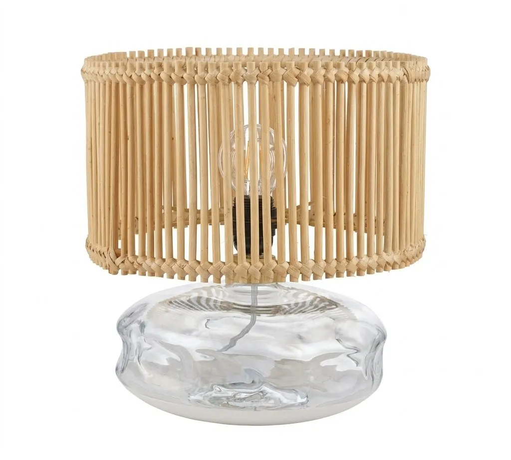 تُعد أباجورة سيلينا تتميز الأباجورة بمظلة (شيد) مصنوعة يدوياً من الخيزران (البامبو) مع قاعدة زجاجية منسابة بتصميم متموج، مما يضفي لمسة طبيعية هادئة على أي ديكور داخلي. تعمل شرائح البامبو الرأسية على خلق تلاعب ساحر بين الضوء والظلال، مما يوزع إضاءة دافئة ومنقوشة تعزز من أجواء غرفة المعيشة، غرف النوم، أو المداخل.