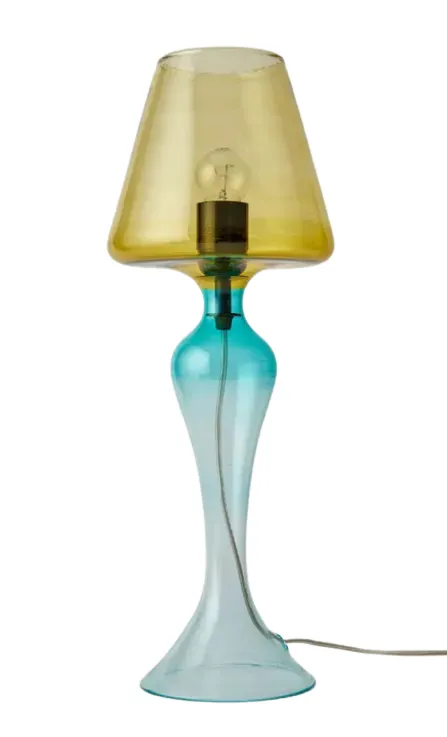 اباجورة بشابوه زجاجي فريد مع قاعدة زجاجية متناسقة، تجمع بين الأناقة والتصميم الفني. توفر إضاءة دافئة وناعمة تضفي جواً راقياً وجذاباً على المكان. مثالية لغرف النوم أو المعيشة أو الزوايا الديكورية.