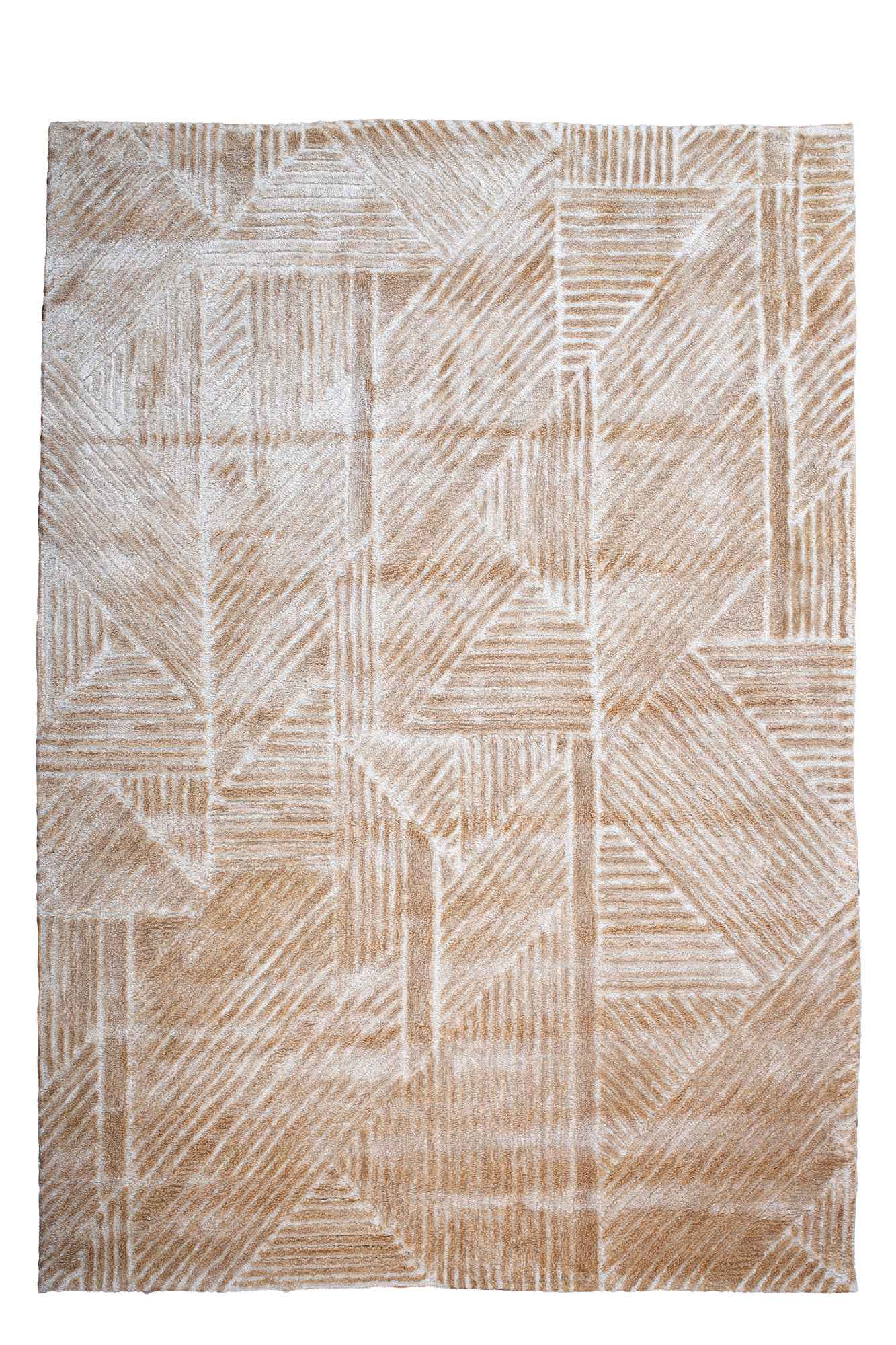 سجادة لاش تجمع بين الهندسة الهادئة والملمس الغني في تصميم عصري أنيق. تتميز بنقوش مثلثة وخطوط متداخلة بدرجات البيج الدافئة، مما يمنح المساحة عمقًا بصريًا ولمسة راقية.