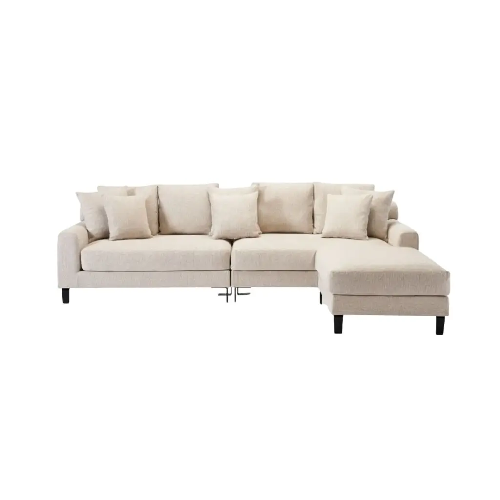 The Alenny L-shape sofa combines a sleek, minimalistic design with both elegance and comfort. Wrapped in soft fabric and adorned with plush cushions, it serves as the perfect centerpiece for living rooms, lounges, or family spaces.