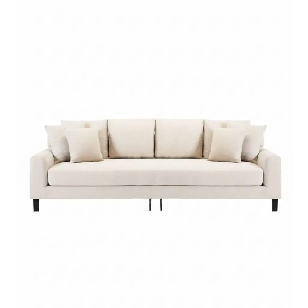 The Alenny three-seater sofa beautifully combines comfort and style. It features premium fabric upholstery and soft cushions that invite relaxation. With its sleek black legs, it not only offers stability but also adds a modern touch, making it an ideal choice for living rooms, lounges, or family areas.