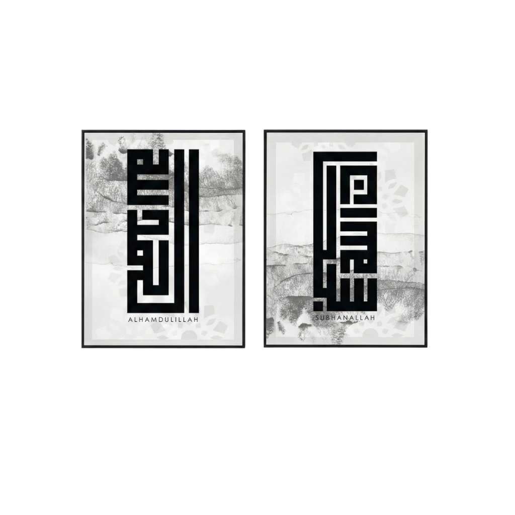 A refined pair of Islamic calligraphy artworks featuring Alhamdulillah and Subhan Allah, reproduced from historical Quranic manuscript styles. Thoughtfully framed, this set brings balance, meaning, and quiet beauty to any space.