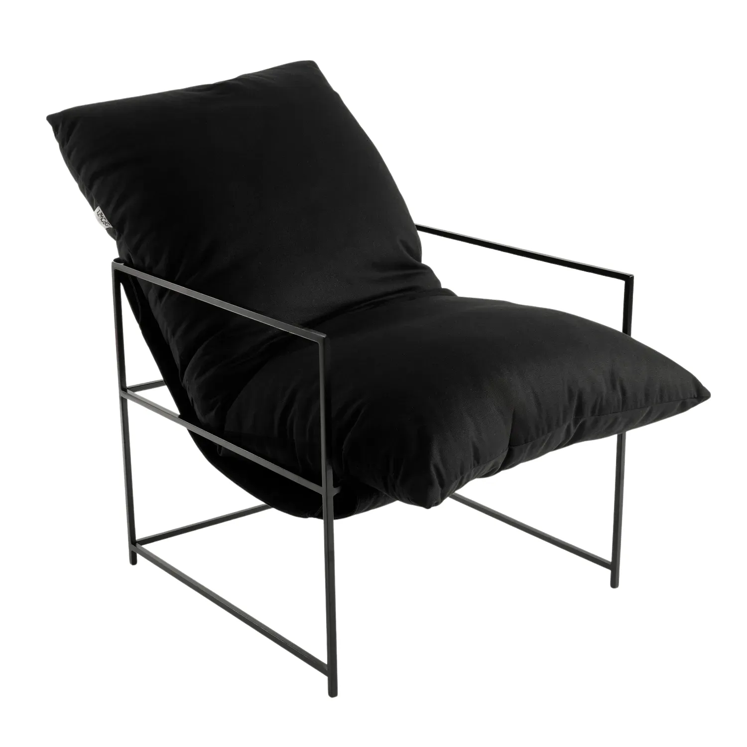 A contemporary lounge chair featuring a minimalist metal frame paired with plush black cushions for relaxed and comfortable seating. Its clean lines and soft upholstery make it a stylish addition to living rooms, reading corners, or lounge areas.