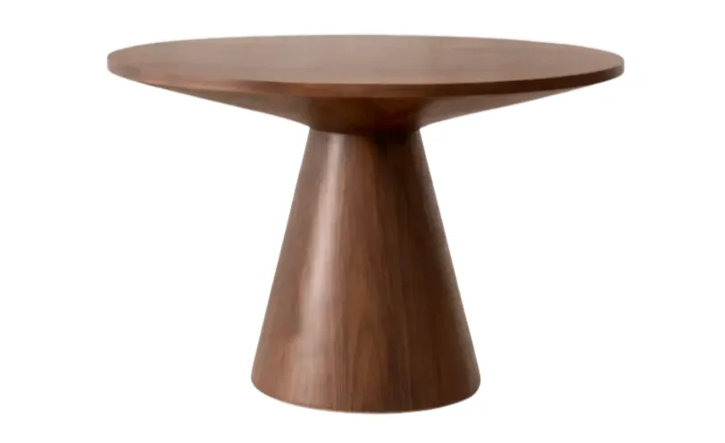 A dining table made of beech wood featuring a striking pedestal base that flows seamlessly into a broad, engineered wood top finished with premium natural veneer. Its sculptural silhouette not only provides a spacious surface for family gatherings but also serves as a sophisticated focal point in any contemporary dining room or open-plan living area.