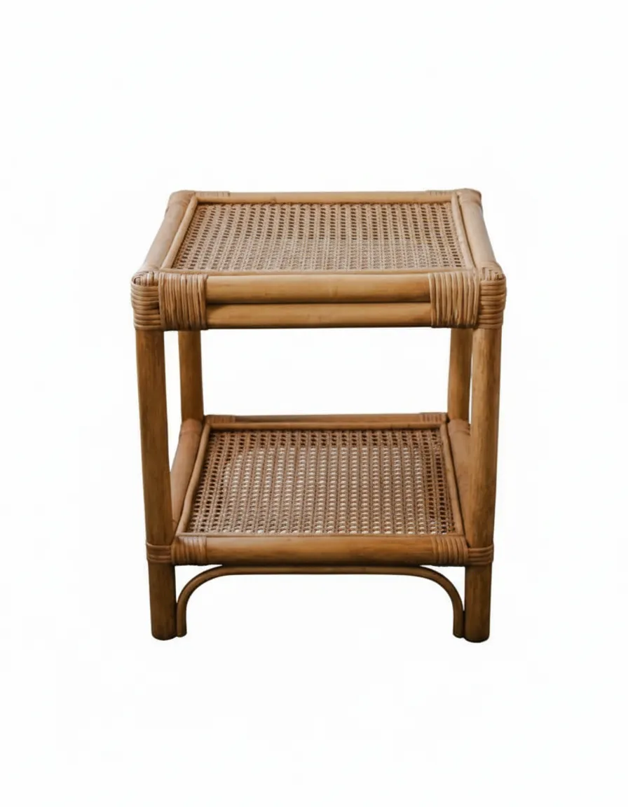 A stylish square-shaped side table made of natural bamboo and woven cané, featuring two functional levels for added storage or display. Its airy, handcrafted look blends beautifully with bohemian, tropical, or natural-style interiors—perfect for living rooms, bedrooms, or covered patios.