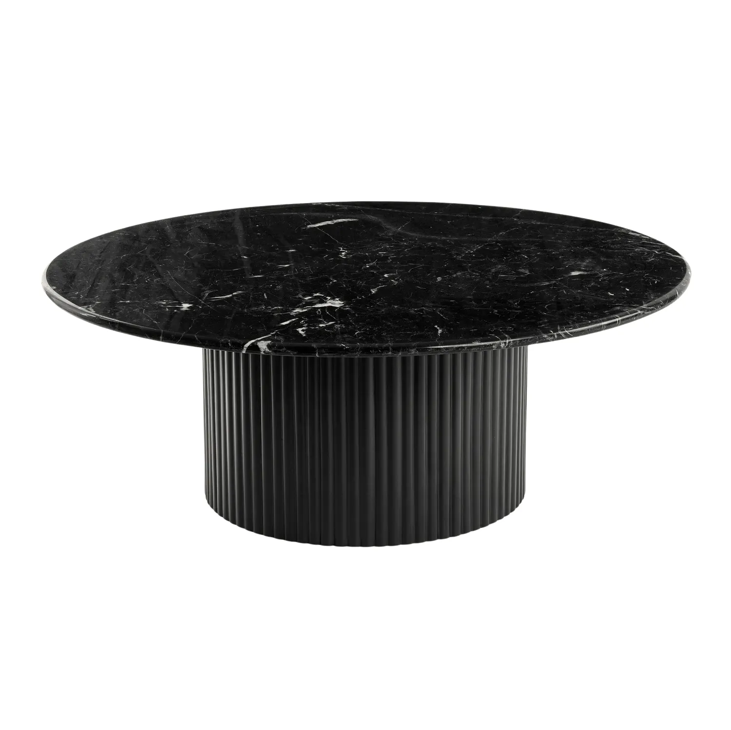 A center table with a black marble top and ribbed wooden base, featuring a detachable tabletop for easy handling and versatility.