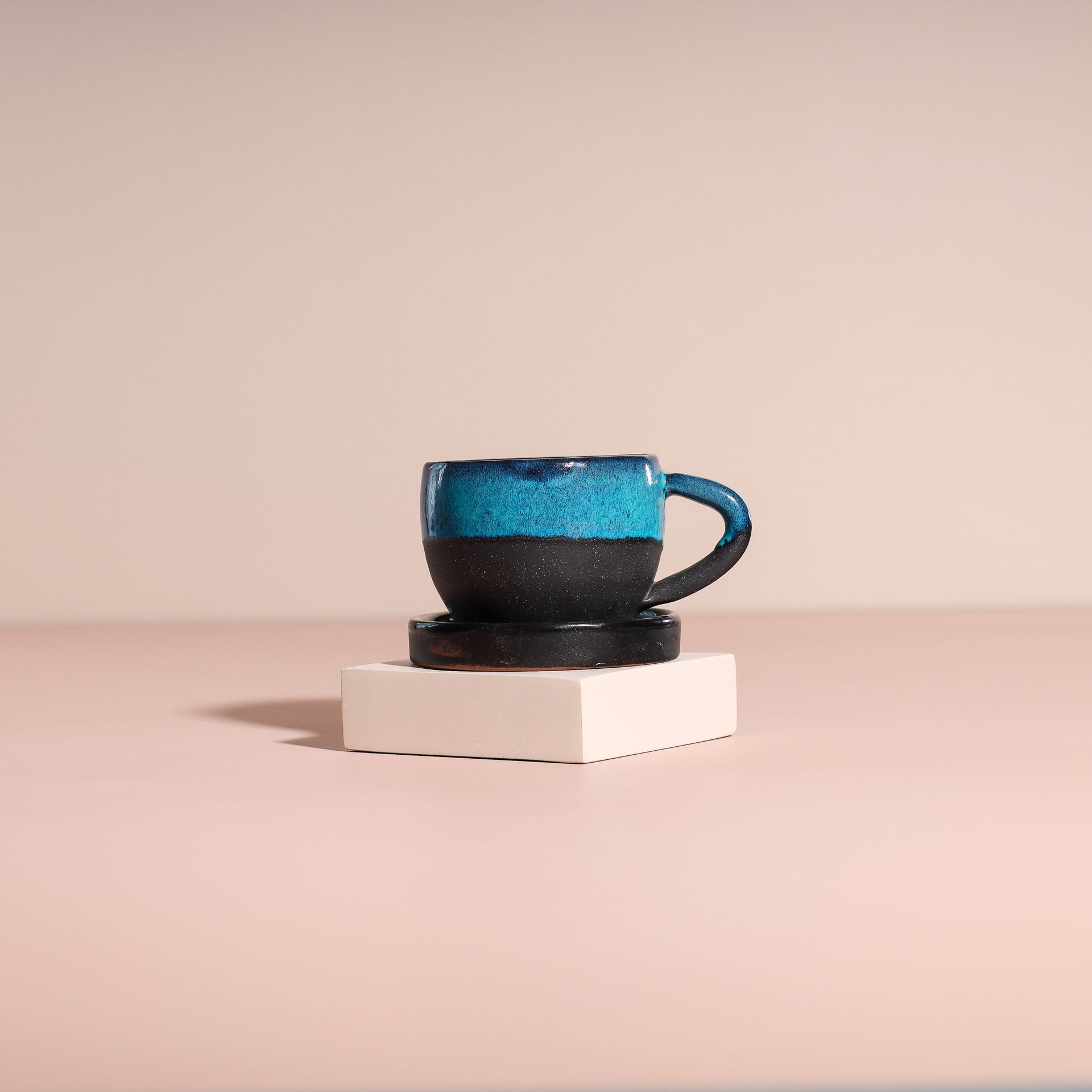 Elegant Design: The Blue Mist Mug features a captivating two-tone finish with a calming blue upper half and a textured black lower half.Handcrafted Pottery: Made from high-quality pottery, giving it an artisanal touch with unique variations.Comfortable Handle: Designed with an ergonomic handle for easy and comfortable use.Versatile Capacity: Perfect for enjoying your favorite hot beverages, whether it's coffee, tea, or hot chocolate.Matching Saucer: Comes with a coordinating saucer for added functionality and style.Charming Addition: A beautiful addition to your drinkware collection, ideal for cozy mornings or entertaining guests.