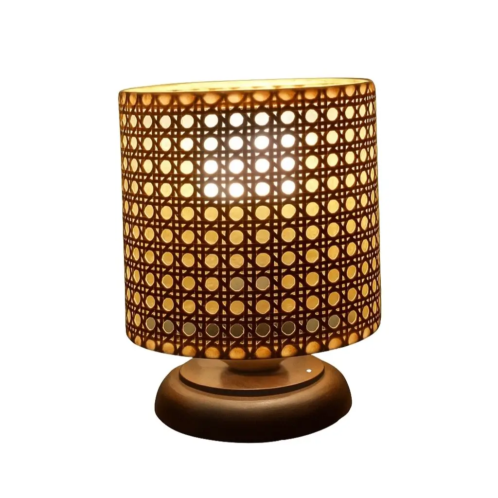 The Boho table lamp combines natural textures with modern elegance. Featuring a dark wood base and an open-weave rattan shade framed with fabric, it casts a soft glow that enhances cozy, stylish interiors.