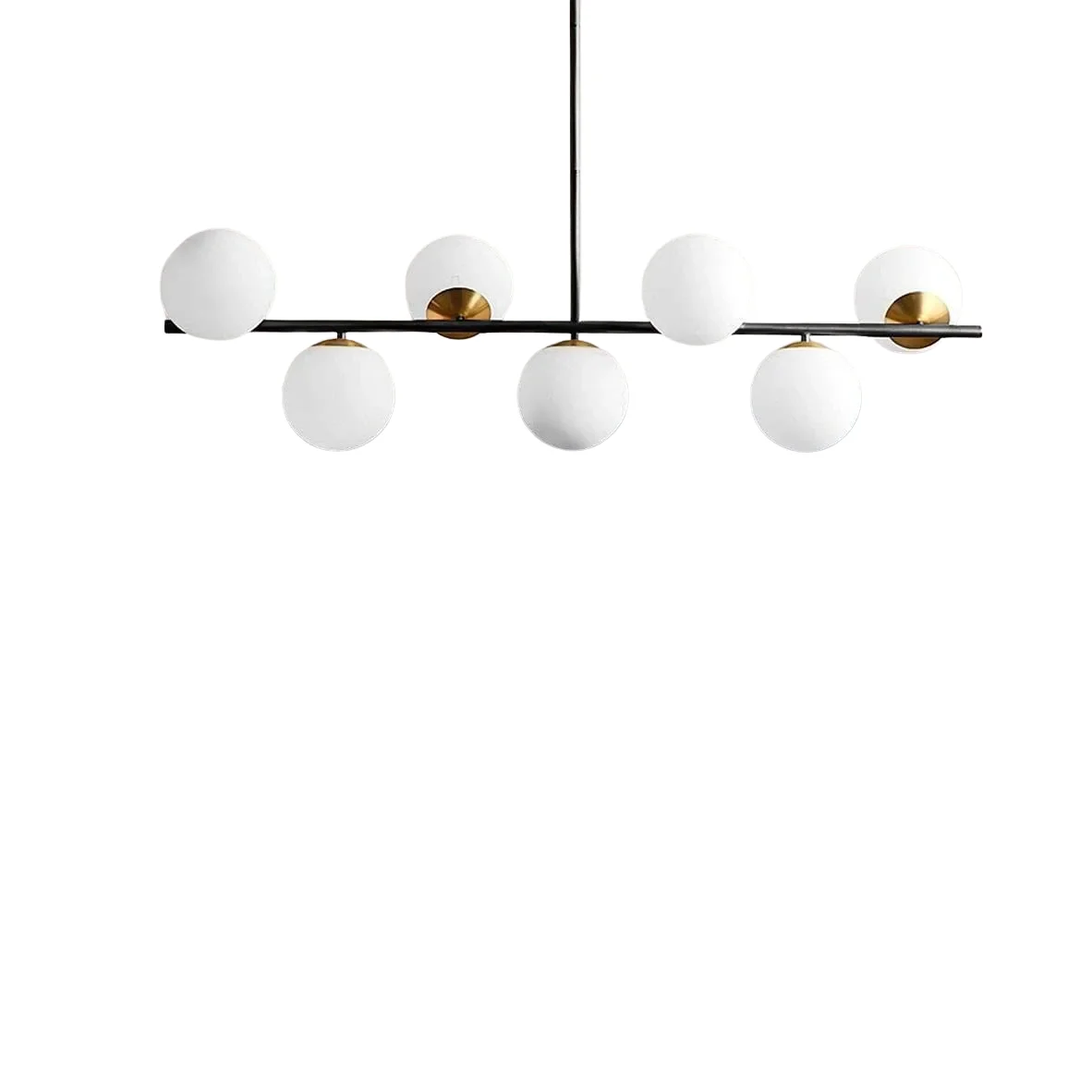 A ceiling lamp made of durable steel with a black and gold corean electrostatic finish, designed with seven opal glass globes that emit a soft, warm glow. Equipped with seven sockets (bulbs not included), it is perfect for dining tables, kitchen islands, or open living areas. Its simple yet attractive design makes it a stylish centerpiece for modern and sophisticated interiors.