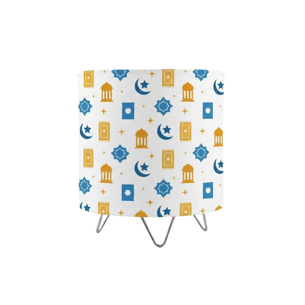 - Drum-shaped fabric shade featuring elegant lantern, crescent, and geometric patterns