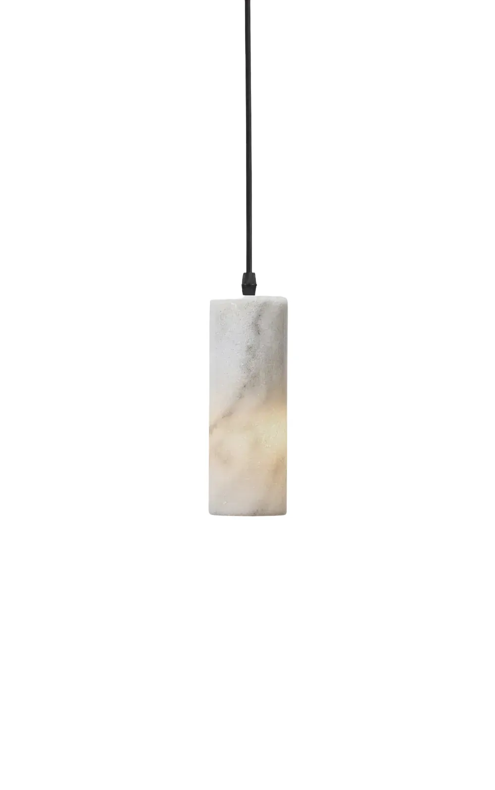A column shape light pendant with a marble cylinder that conceals the light source deep inside, creating a simple suspended downlight. As light penetrates the stone, it reveals the translucency and delicate nature of marble while showcasing the natural beauty of its veining. Made from S02 Italian Carrara Marble, it includes a replaceable 6.5W E14 bulb (2700K / 470 lm / CRI>80), non-dimmable. Designed for indoor use, it emits a soft diffused glow from the sides and a focused downlight from the bottom.