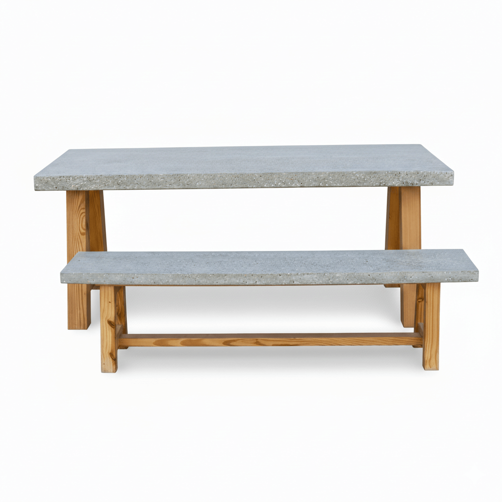 The Bella Dining Set blends modern durability with natural warmth. Featuring a solid concrete tabletop paired with solid wood legs and benches, this dining set is designed for both indoor and outdoor use. Its clean lines and balanced materials make it a timeless centerpiece for everyday dining and gatherings.