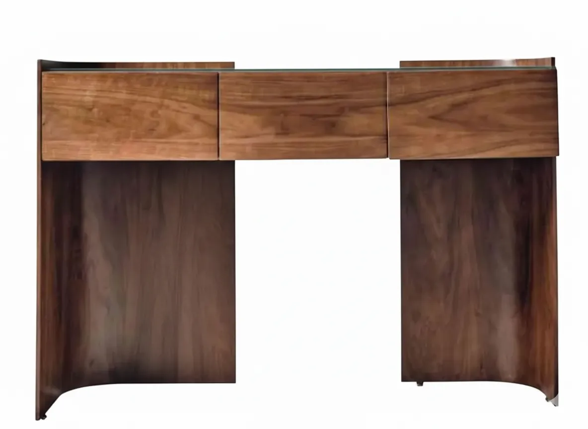 A dresser made of premium walnut veneer, featuring spacious drawers in a practical design that offers ideal storage for accessories, daily essentials, and personal items. It can also be used as a desk with a chair or pouf. Its high-quality construction ensures long-lasting use.