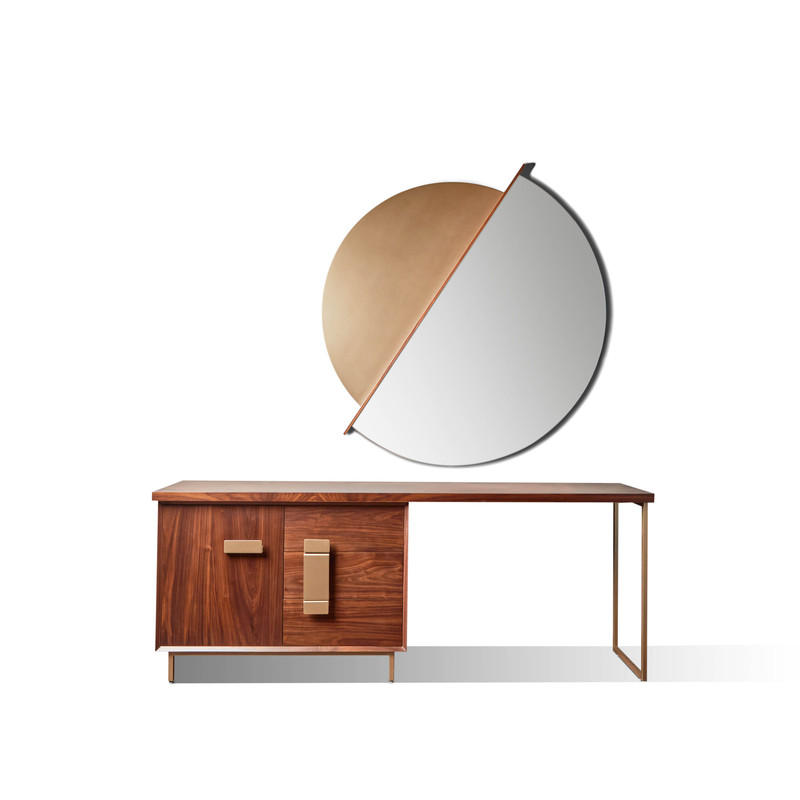 Wooden dresser of one cabinet, three drawers and an extended wooden top in natural walnut veneer finish with metal handles and base legs in electrostatic champagne metal finish; that comes with a round mirror consisting of a semi circle metal piece in electrostatic champagne metal finish and a wooden strip in natural walnut veneer.