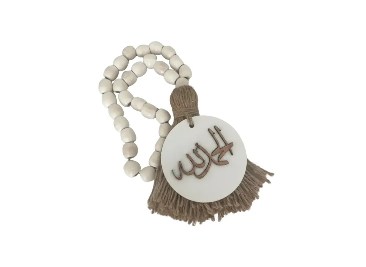 The Elhamdulelah White Rosary is designed to inspire moments of reflection and gratitude. Featuring the phrase "الحمد لله" in a chic white color, this rosary radiates simplicity and calm. Its pure white design fits seamlessly into minimalist or contemporary decor, while the natural wood beads and soft tassel bring warmth and authenticity. Hang it in your home to bring a sense of thankfulness and serenity to your everyday surroundings