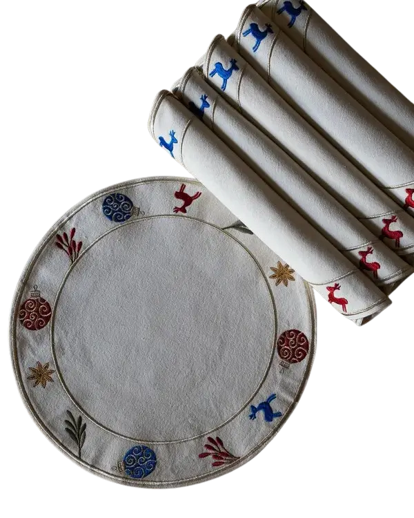 Add a cheerful festive layer to your table setting with the Festive Ornaments placemat set. Featuring playful embroidered holiday motifs, this round placemat design brings warmth, color, and seasonal charm to everyday dining.