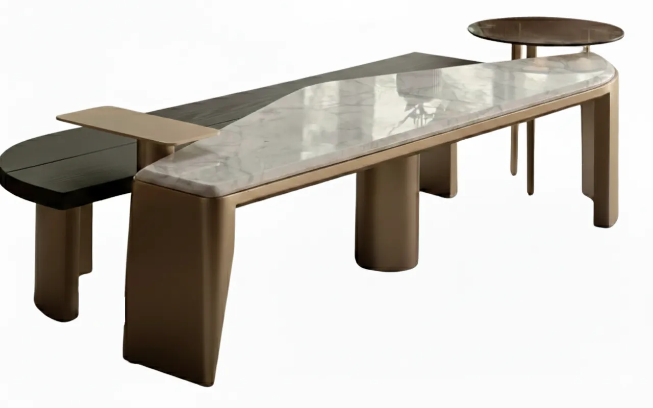 An elegant coffee table, crafted from sleek oak veneer and topped with beautiful white Carara marble, all finished with a sophisticated lacquer. When paired with a stylish gold side table featuring a glass top, it becomes a modern yet timeless centerpiece, perfect for both entertaining guests and enjoying cozy family moments.