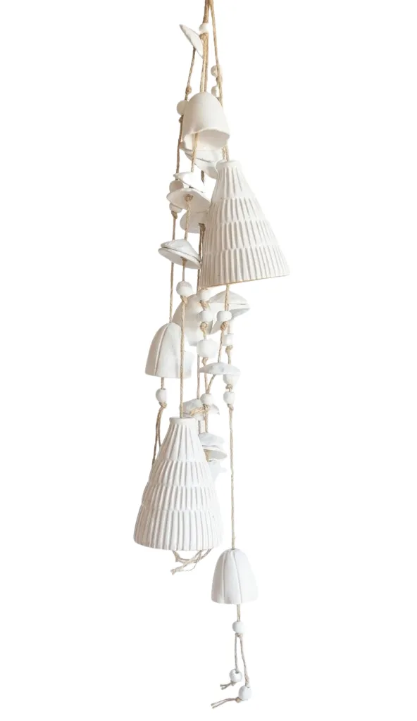 A hanging bells garland made out of pottery adds a rustic and artistic charm to any space. Each handcrafted bell is strung together to create a flowing decorative piece that brings texture and character to your walls or doorways. Perfect for boho, rustic, or eclectic interiors, this garland blends natural materials with artisanal craftsmanship for a unique, earthy accent.