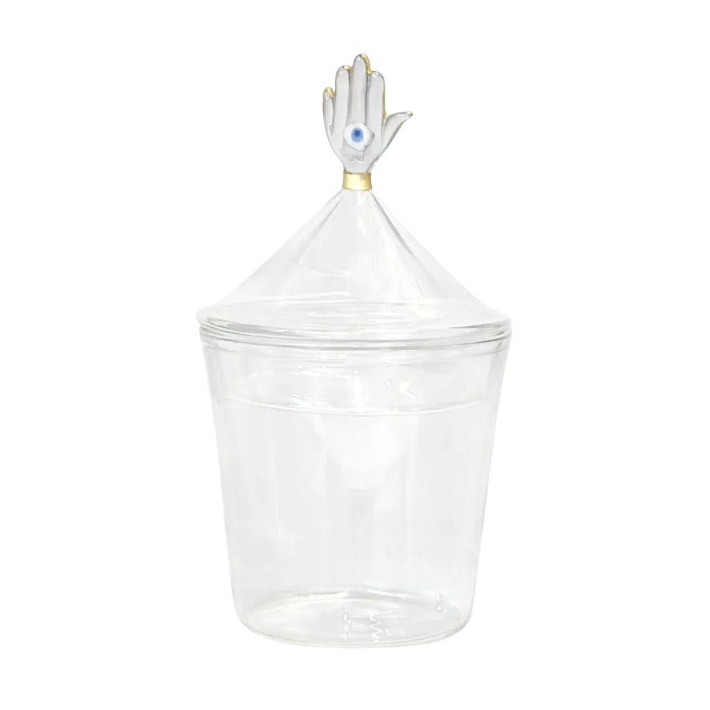 Inspired by the traditional lanterns of Ramadan, the Kaf glass food container showcases a unique palm-shaped finial that adds both symbolic meaning and decorative flair. Made from high-quality transparent glass in a sophisticated grey hue, it enhances the beauty of festive table settings.