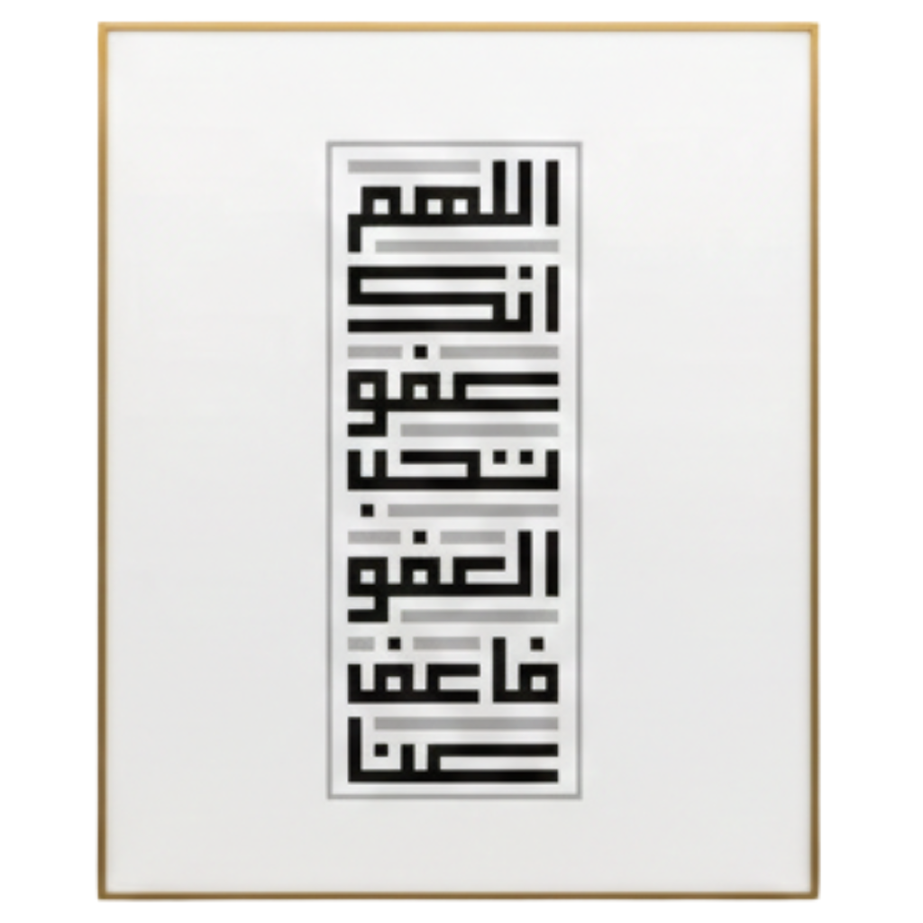 Kufic Dua Wall Art showcases the beauty of early Islamic calligraphy through a bold vertical Kufic composition. Set against a clean, neutral background, the structured geometry of the script creates a powerful visual presence rooted in tradition yet perfectly suited to modern spaces.
