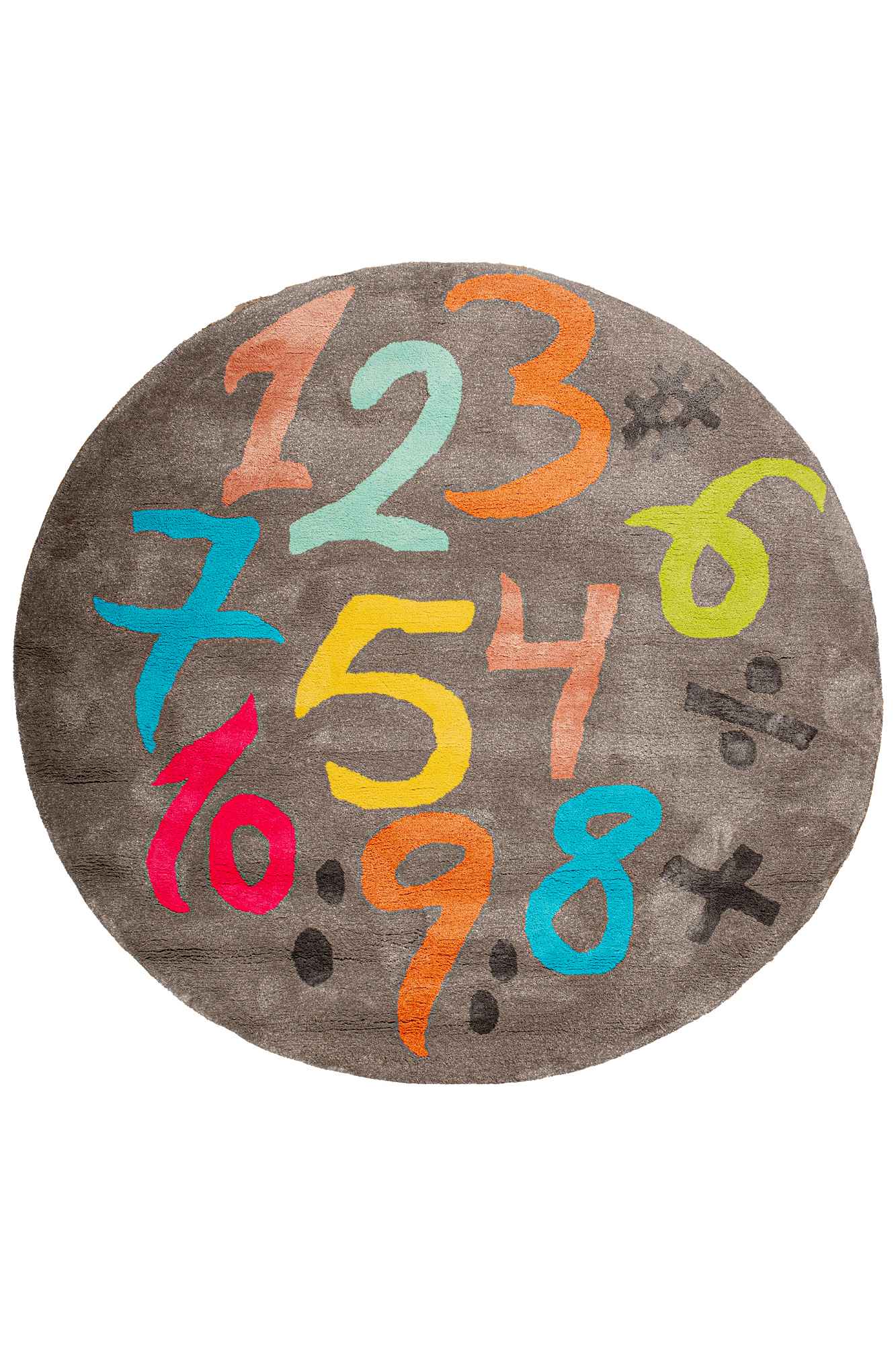- Round shape featuring colorful numbers in a playful, hand-drawn style