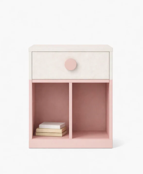 The Luna Night Stand is a charming and practical addition to your child’s room. Featuring soft blush details and a clean, minimalist form, it offers a smooth top drawer for essentials and open storage below for books or toys.