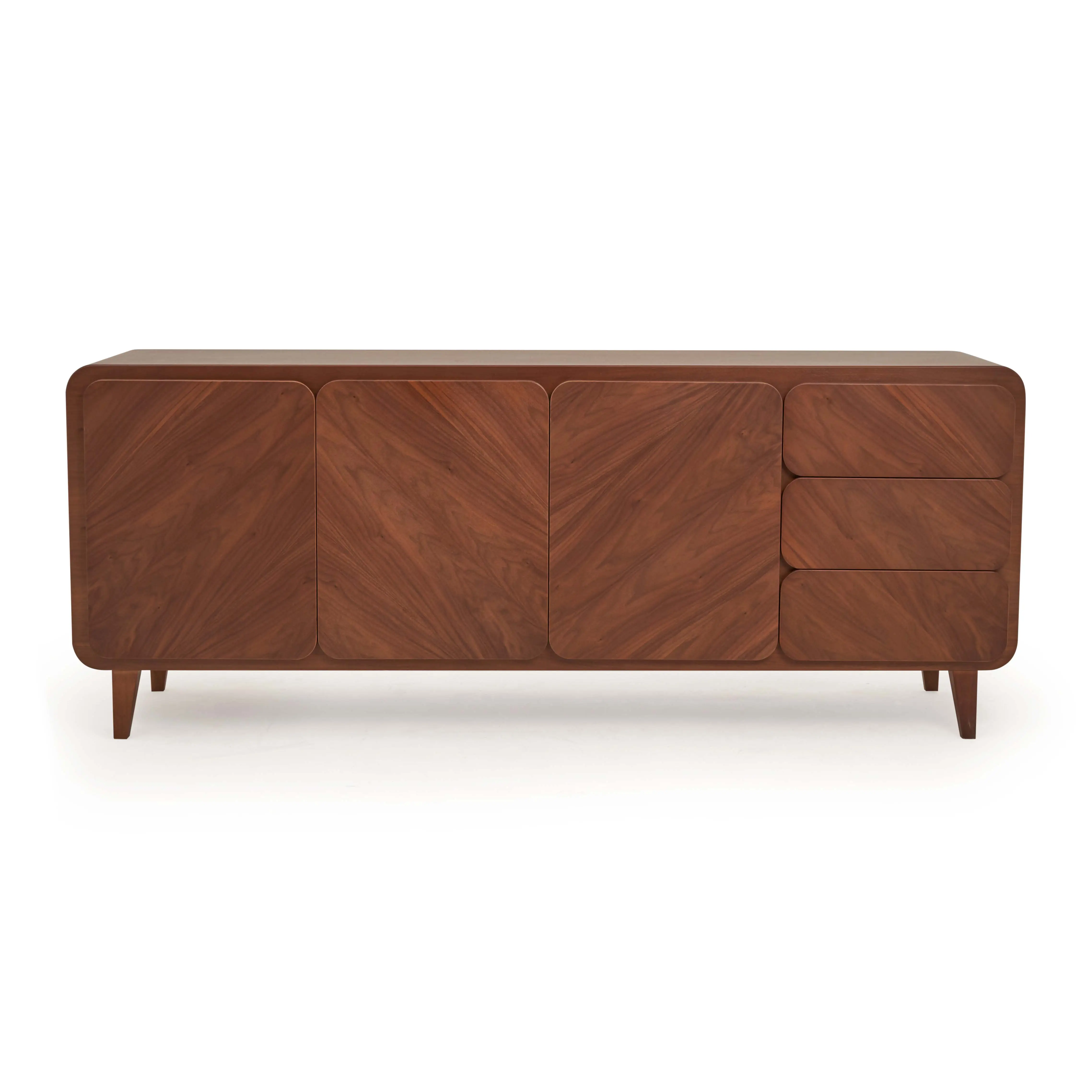 The Matlota Sideboard is designed to perfectly complement the Matlota dining table, capturing the same balance of playfulness and refined craftsmanship. Its rounded front corners soften the silhouette, while the 45-degree veneer layout creates a rhythmic V-pattern that brings a charming retro feel. Chamfered door and drawer fronts allow smooth opening without handles, keeping the veneer surface uninterrupted and beautifully clean.