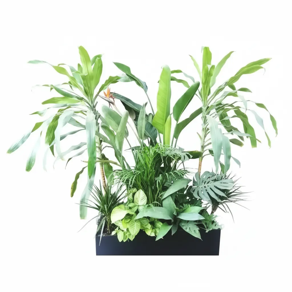 A natural indoor arrangement, featuring a lush mix of Augusta, Birds of Paradise, Monstera, Dracaena Massageana, Dracaena Compacta, Lily, Syngonium, Salome, and Areca in one pot made of fiber. Planted in a durable fiber pot, this rich combination creates a mini indoor jungle that thrives in partial sun to partial shade and requires moderate watering, making it a bold and elegant centerpiece for living rooms, offices, or entryways.