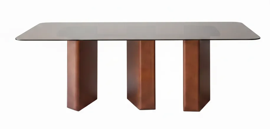 A modern dining table that showcases beautiful beech and rich burl walnut veneers, all topped with a striking glass surface. This piece blends contemporary design with lasting durability, creating a warm atmosphere perfect for both special occasions and everyday meals. Key Features: - High-quality beech and burl walnut veneers for elegance and durability. - Sleek glass top for effortless cleaning and a classic look. - Modern design that fits beautifully in sophisticated dining spaces.