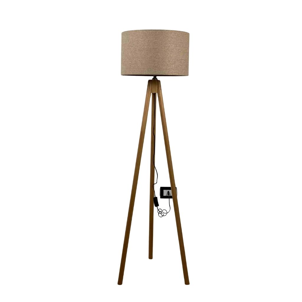 A fabric floor lamp that merges style with practicality, featuring a natural beech wood base with three slanted legs and a handwoven fabric shade. It casts a warm inviting glow, making it perfect beside a sofa or chair as both a functional light source and a decorative accent. With its refined organic aesthetic, it fits seamlessly into minimalist, bohemian, or Scandinavian interiors.