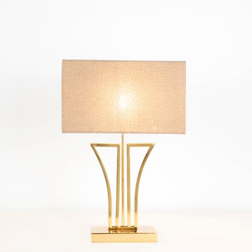 A side lamp with a beige fabric shade in a classic design, paired with a golden metal base for a refined touch. It provides a warm, gentle glow that enhances comfort and ambiance indoors. Perfect for side tables in bedrooms, living rooms, or elegant corners.