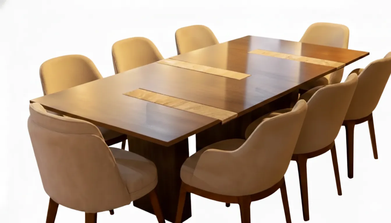 This elegant dining table showcases a refined balance of natural warmth and contemporary luxury. Crafted with rich walnut veneer and accented by beige Breshia Aurora marble inlays, it creates a striking centerpiece ideal for sophisticated dining spaces.