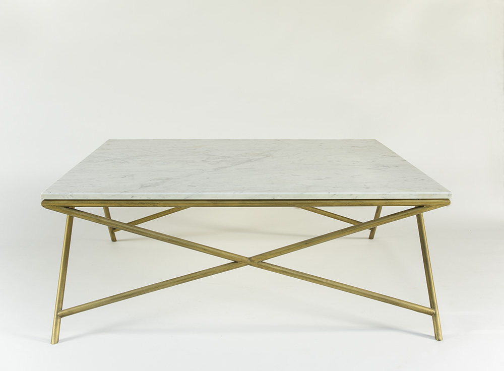 A coffee table featuring an X-shaped base crafted from clean-lined round steel bars with a metallic finish, adding a modern twist to a classic design. The rectangular white manufactured marble top enhances the look with a sophisticated, elegant touch.