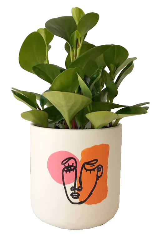 The Peperomia Obtusifolia is a compact, glossy-leaf plant known for its fresh green tones and easy-care nature. Styled in a playful face-designed pot, it adds a modern, artistic touch to shelves, desks, and sunny corners.