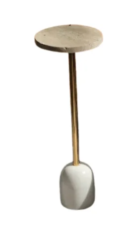 A luxurious side table with a round travertine marble top, supported by a slim metal leg and a solid white Carrara marble base. Its sturdy and elegant design makes it suitable for both outdoor and indoor spaces such as office corners, living rooms, bedrooms, or entryways.
