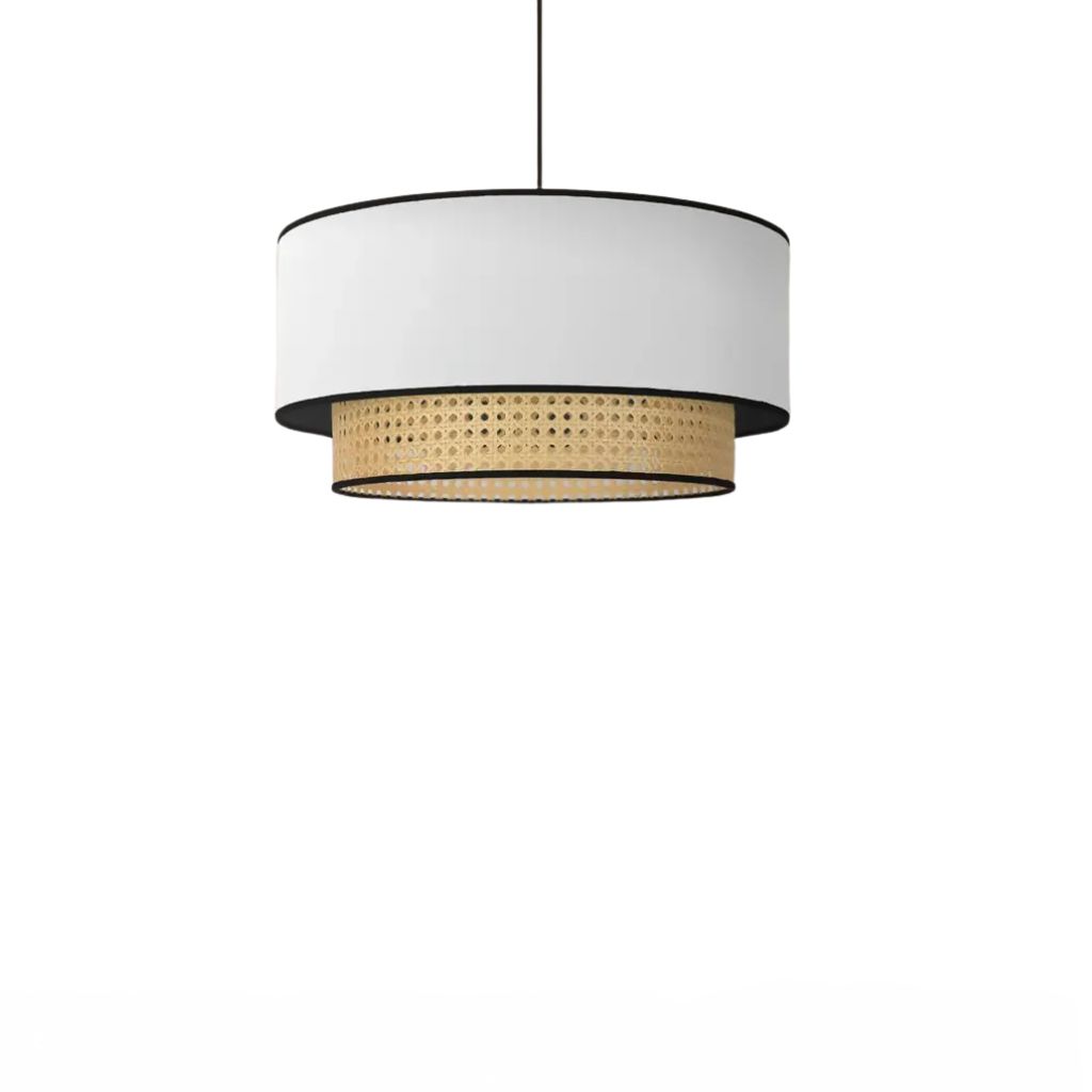 A round modern ceiling lamp made of steel with fabric and rattan details, designed with four sockets (bulbs not included). It is recommended to use LED E27 bulbs. Made in Egypt, this lamp is ideal for dining areas, living rooms, or cozy corners that need a natural, stylish touch.