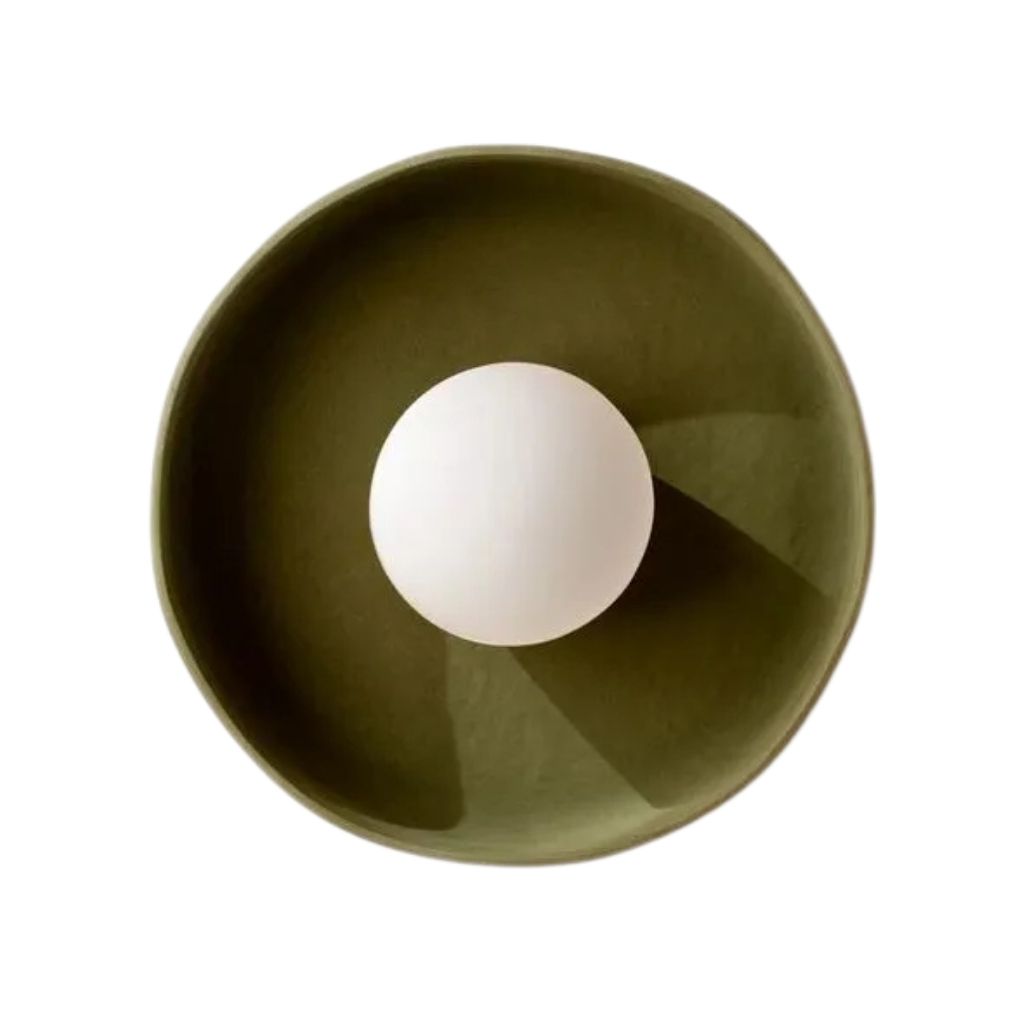 A wall applique constructed from sturdy round fiberglass with a glass sphere shade, offering a refined yet organic appearance. Available in three earthy tones—off-white, brown, and green, it provides striking lighting that enhances the space without overpowering the wall. Suitable for both indoor and outdoor use, this piece blends style with functionality, working beautifully as a standalone accent or in groups for a balanced, rhythmic effect.