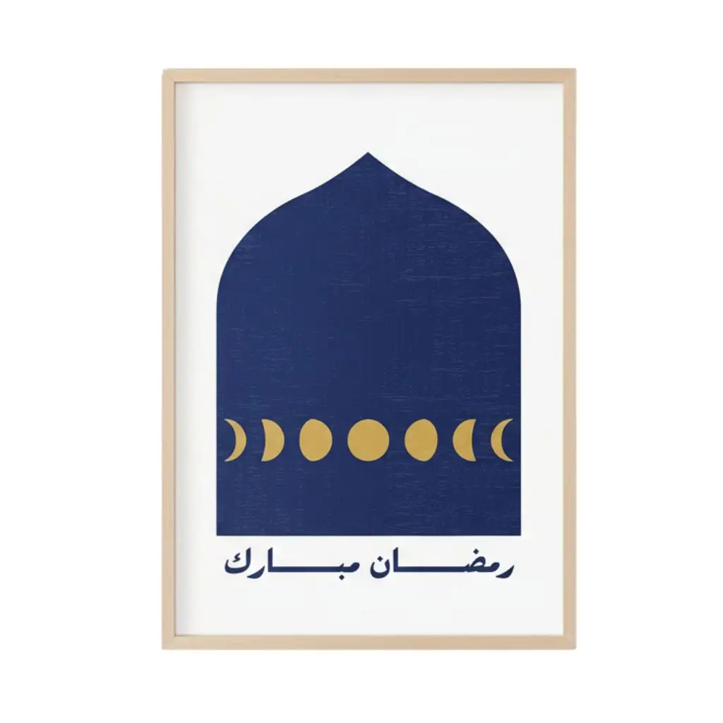 Ramadan Mubarak wall art captures the calm rhythm of Ramadan through a deep navy arch and a row of golden moon phases. A clean, modern statement that adds meaning and elegance to seasonal home décor.