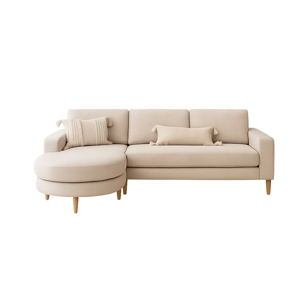The Rema Sectional Sofa brings modern comfort and effortless elegance to any living room. With its smooth, rounded lines, plush cushions, and warm beechwood legs, it creates an inviting atmosphere perfect for lounging, entertaining, or relaxing with family.