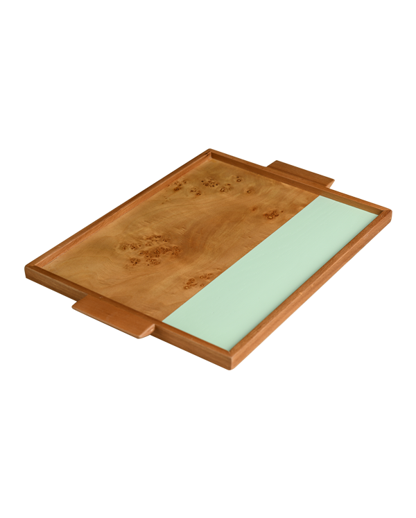A tray with lasting quality and durability, made from sturdy natural beechwood with an apple root veneer and a partial surface coating. It comes in a rectangular shape with a handle for easy use. Care instructions: Use a soft, clean cloth with lukewarm water and a few drops of mild dish soap to gently wipe and clean the wooden tray. Once finished, place it in a well-ventilated area to dry.