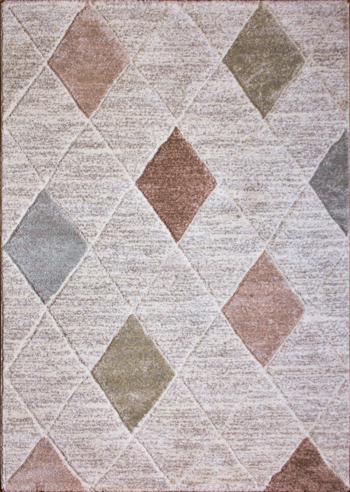 - Geometric diamond pattern in beige, brown, green, and gray tones