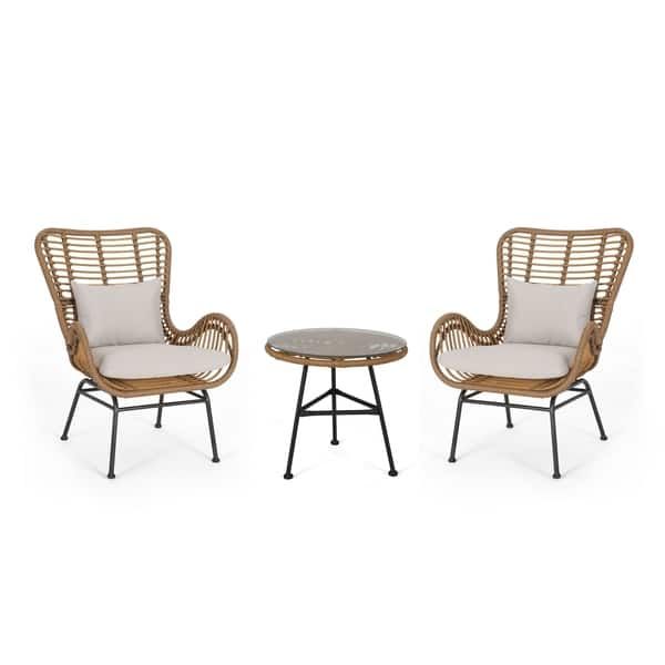 A seating set made of rattan and metal, this outdoor collection is a masterfully designed furniture suite that pairs artisanal weaving with a sturdy industrial base. Featuring two oversized wingback chairs and a matching circular side table, this set provides a luxurious and comfortable experience for gardens, patios, or contemporary balconies.